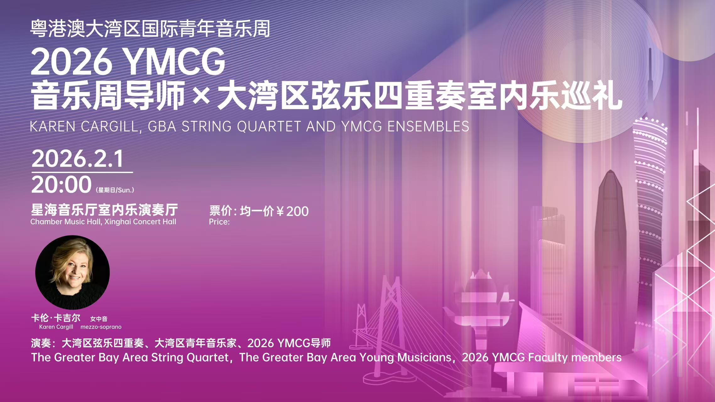 苏格兰著名女中音卡伦·卡吉尔携手由港深广澳四大乐团演奏家组成的大湾区弦乐四重奏与 YMCG 国际导师、及大湾区青年音乐家,精选七部室内乐经典,横跨浪漫主义晚期至二十世纪初,展现多位作曲家的独特风格与室内乐艺术的丰富形态。整场曲目串联起从德奥到法英的多元音乐传统,在室内乐中折射出半个多世纪欧洲音乐的风格流转与艺术追求。