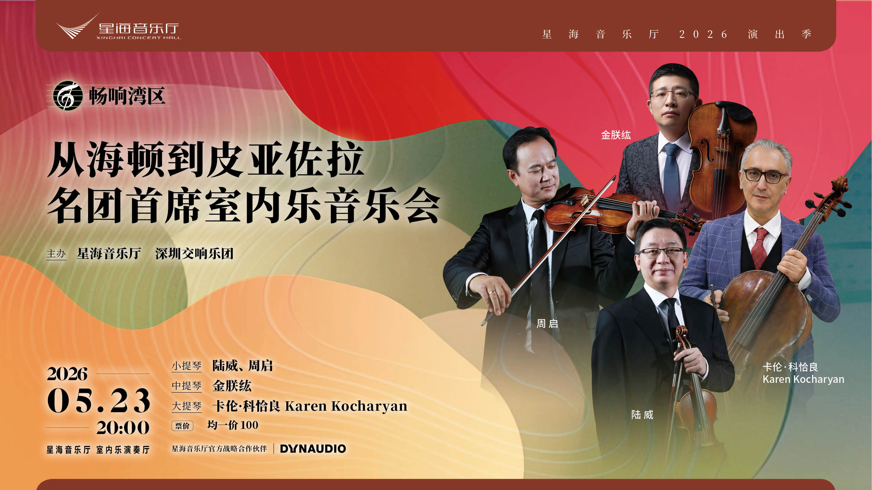 国际著名小提琴家、德国柏林德意志交响乐团终身首席陆威,德国慕尼黑爱乐乐团终身小提琴演奏家、慕尼黑爱乐室内乐团小提琴声部首席周启,联袂深圳室内乐团团长、深圳交响乐团中提琴首席金朕纮与大提琴首席卡伦·科恰良(Karen Kocharyan),四位名家将呈现弦乐四重奏的精致对话与深层共鸣。整场演出融汇古典、浪漫乃至探戈多元风格,淋漓展现弦乐四重奏这一体裁无限的表现力与艺术深度。